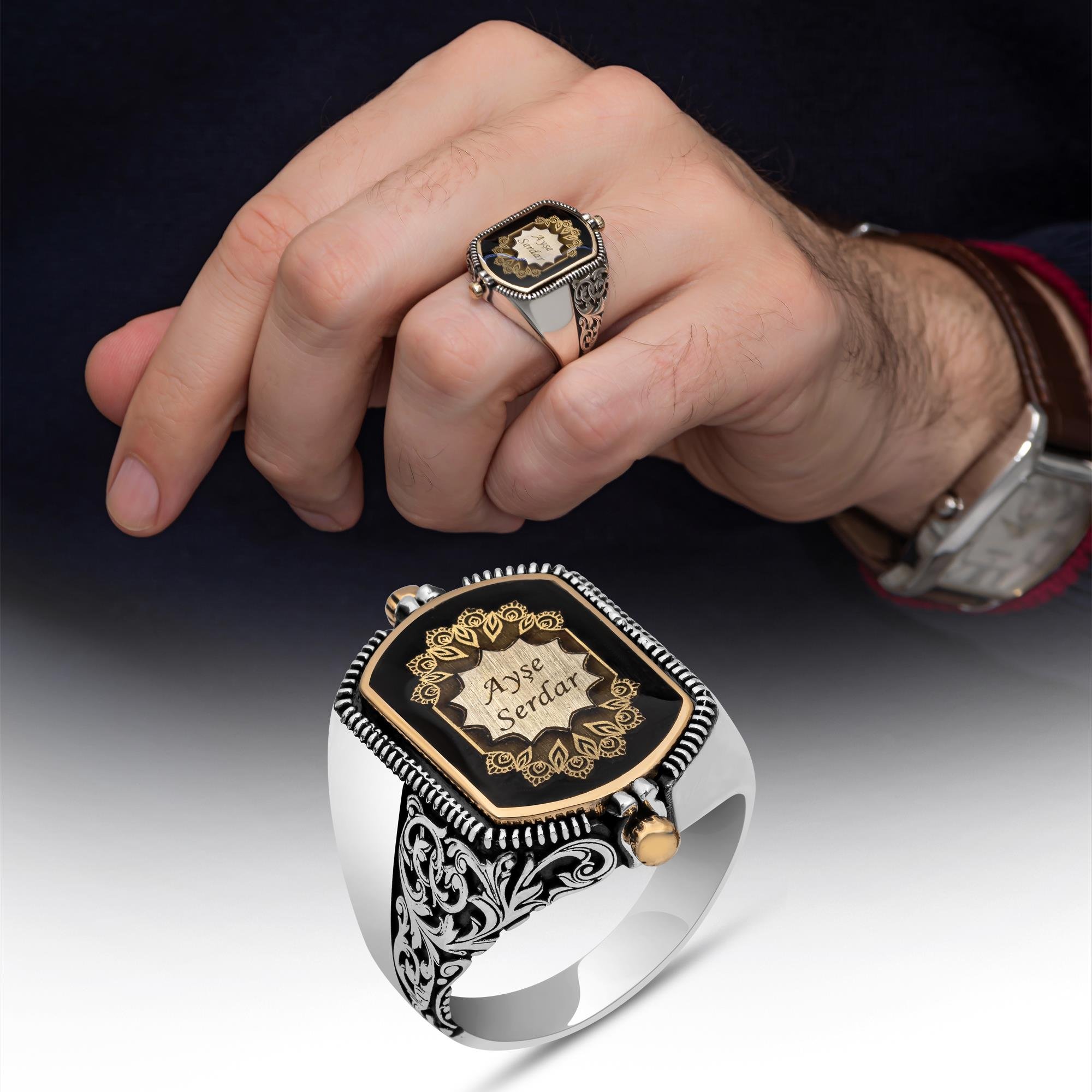 Çift Taraflı İsimli Siyah Mineli 925 Gümüş Erkek Yüzük